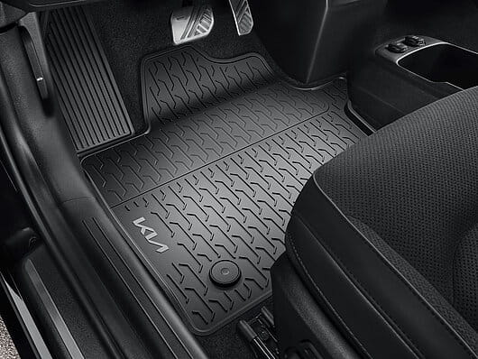 Bez względu na to, jaką przygodę przeżyłeś, nie martw się o mokre, błotniste lub piaszczyste buty, gdy wrócisz do samochodu. Te trwałe i łatwe do czyszczenia dywaniki chronią całą podłogę kabiny. Dzięki dostosowanemu kształtowi i punktom mocowania, które trzymają je mocno na miejscu. W pierwszym rzędzie mają logo EV6.
